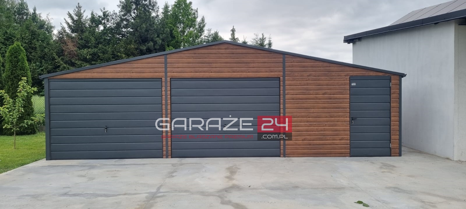 Garaż blaszany PREMIUM 9x6m ciemny orzech + grafit, dwie bramy uchylne +drzwi ,wzmocniony profilem zamkniętym ocynkowanym