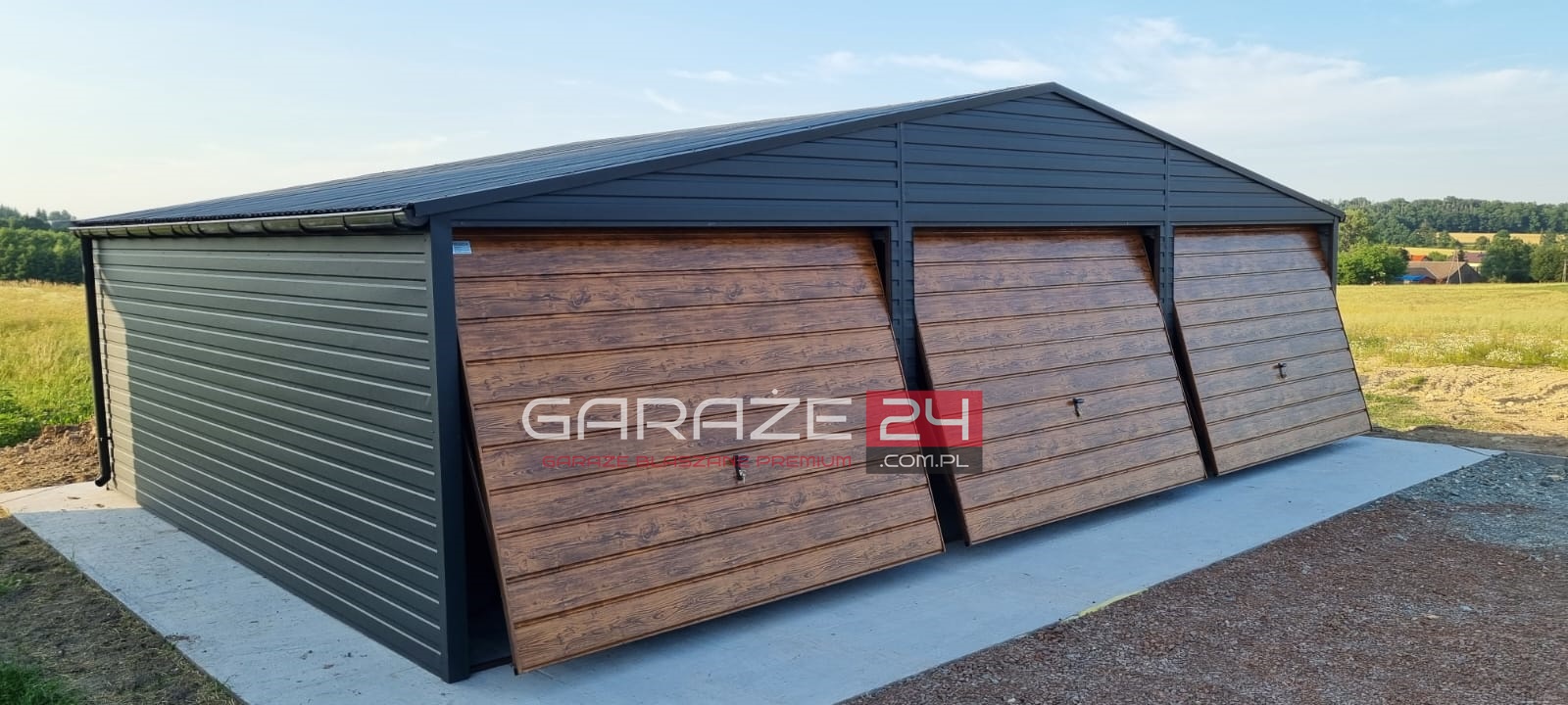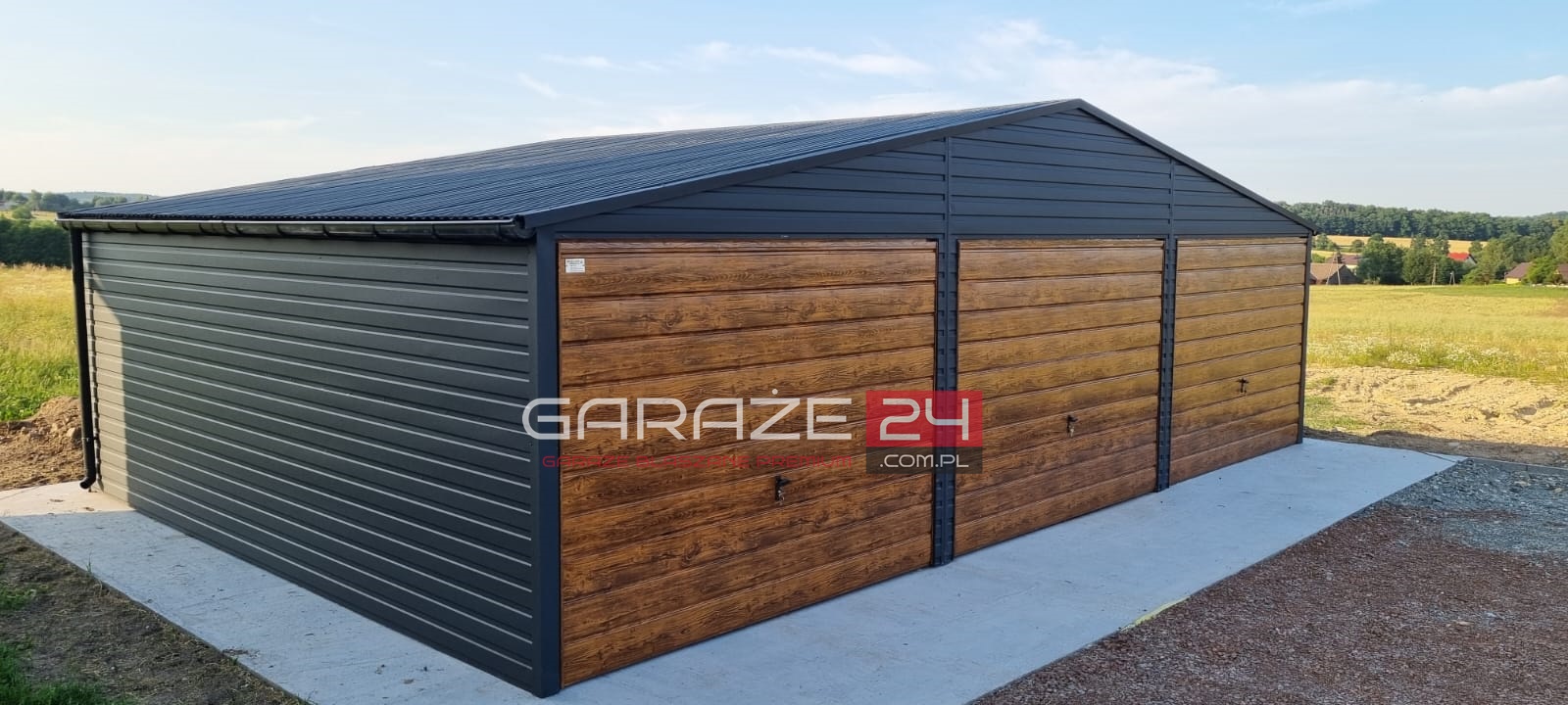 Garaż blaszany PREMIUM 9x6m czarny mat + ciemny orzech , trzy bramy uchylne , wzmocniony profilem zamkniętym ocynkowanym